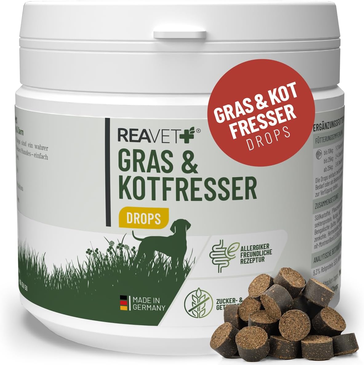 Die ReaVET Gras- & Kotfresser Drops wurden speziell für Hunde entwickelt, die häufig Gras oder Kot fressen – ein Verhalten, das oft auf Magenreizungen, Nährstoffmangel oder Übersäuerung hinweist. Die rein natürlichen Drops mit Heilerde, ayurvedischen Heilpflanzen und Insektenprotein beruhigen den Magen, fördern die Verdauung und unterstützen das Immunsystem.