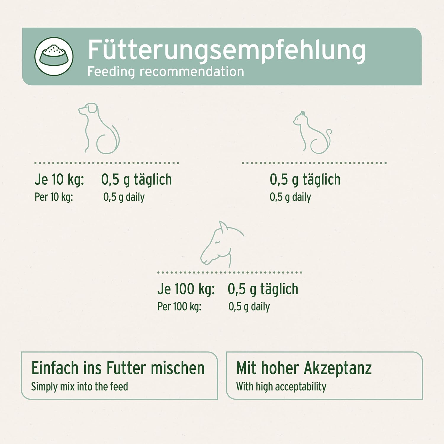 Bei Bedarf kann die empfohlene Menge bis auf das Doppelte erhöht werden. Zur Gewöhnung 3 - 5 Tage mit 50 % der Tagesdosis beginnen. Das Pulver kann einfach unter das Futter gemischt werden.