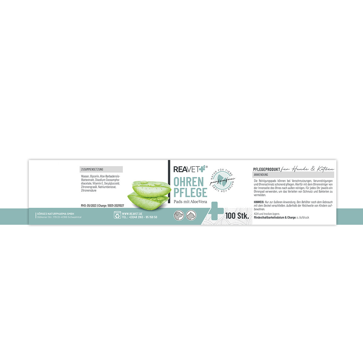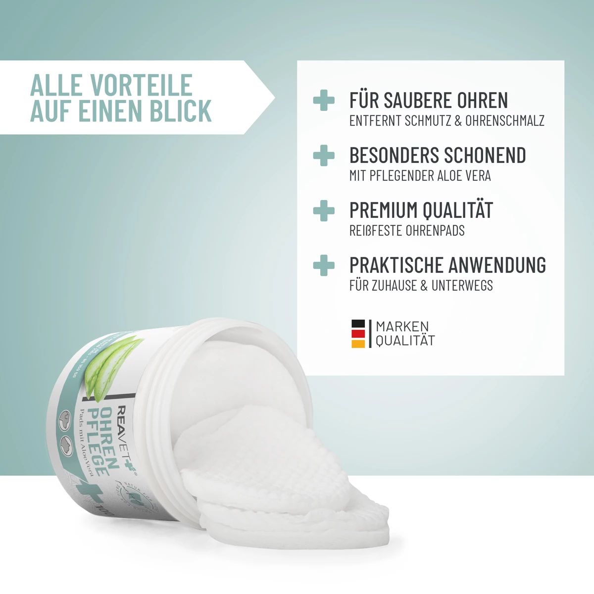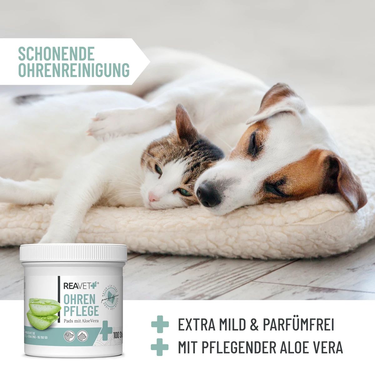 Unsere REAVET Ohrenpflege Pads mit Aloe Vera reinigen und pflegen die äußeren Gehörgänge Ihrer Fellnase auf natürliche Weise. Die Pads sind mit einer milden Reinigungslösung getränkt, die Schmutz, Ohrenschmalz und andere Verunreinigungen sanft entfernt. Aloe Vera wirkt zusätzlich pflegend und beruhigend.
