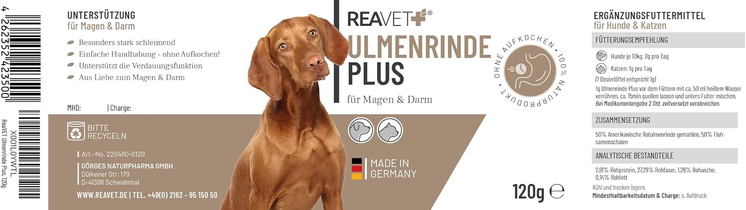 Verdauungsbeschwerden können Deinen Hund oder Deine Katze stark belasten. Ob Übersäuerung, empfindlicher Magen oder unruhige Darmtätigkeit – oft benötigt das Verdauungssystem eine sanfte „Ruhepause“. Die ReaVET Ulmenrinde Plus ist eine innovative Weiterentwicklung der klassischen Ulmenrinde. Durch die Kombination aus original amerikanischer Rotulmenrinde (Slippery Elm Bark) und wertvollen Flohsamenschalen entsteht ein besonders kraftvoller Schleimkomplex, der ganz ohne mühsames Aufkochen auskommt.